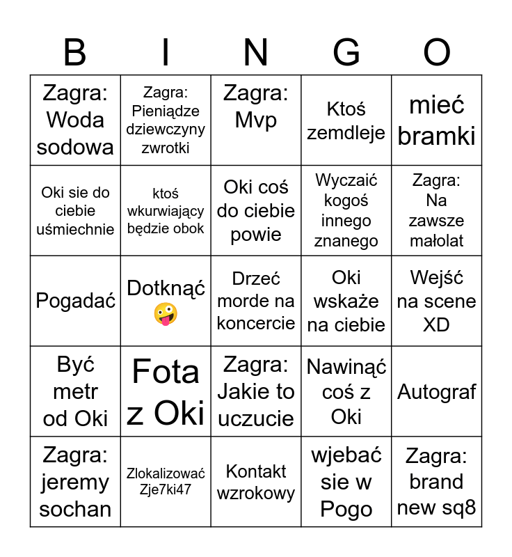 This bingo card has a free space and 24 words: Fota z Oki, Zlokalizować Zje7ki47, Oki coś do ciebie powie, Zagra: jeremy sochan, mieć bramki, Zagra: Woda sodowa, Oki sie do ciebie uśmiechnie, Zagra: Pieniądze dziewczyny zwrotki, Oki wskaże na ciebie, Zagra: Jakie to uczucie, Wyczaić kogoś innego znanego, Pogadać, Nawinąć coś z Oki, Autograf, ktoś wkurwiający będzie obok, wjebać sie w Pogo, Wejść na scene XD, Zagra: Mvp, Zagra: Na zawsze małolat, Dotknąć🤪, Zagra: brand new sq8, Być metr od Oki, Ktoś zemdleje and Kontakt wzrokowy.