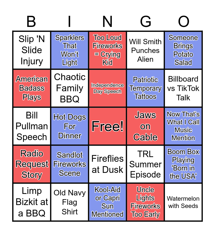 This bingo card has a free space and 24 words: Sandlot Fireworks Scene, Old Navy Flag Shirt, Independence Day Speech, Limp Bizkit at a BBQ, Someone Brings Potato Salad, Slip 'N Slide Injury, American Badass Plays, Sparklers That Won’t Light, Jaws on Cable, Fireflies at Dusk, Patriotic Temporary Tattoos, Bill Pullman Speech, TRL Summer Episode, Boom Box Playing 'Born in the USA', Chaotic Family BBQ, Uncle Lights Fireworks Too Early, Now That’s What I Call Music Mention, Too Loud Fireworks = Crying Kid, Billboard vs TikTok Talk, Hot Dogs For Dinner, Watermelon with Seeds, Radio Request Story, Will Smith Punches Alien and Kool-Aid or Capri Sun Mentioned.