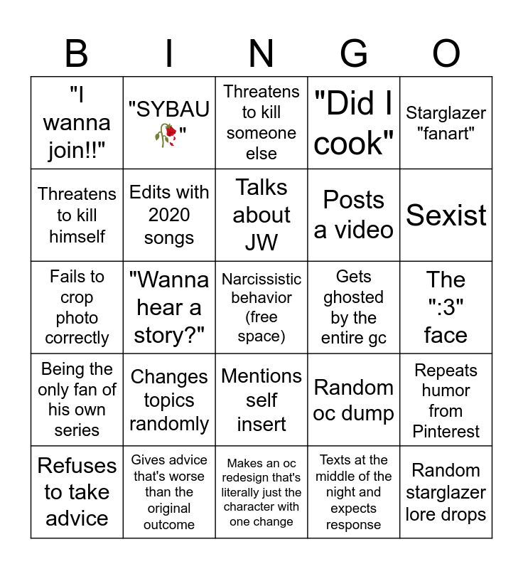 This bingo card has a free space and 27 words: Random oc dump, Sends a photo of his massive forehead, Posts a video, Makes an oc redesign that's literally just the character with one change, Threatens to kill himself, Threatens to kill someone else, "SYBAU 🥀", Being the only fan of his own series, Gets ghosted by the entire gc, Repeats humor from Pinterest, Fails to crop photo correctly, "Did I cook", Refuses to take advice, Gives advice that's worse than the original outcome, Sexist, Copying texts into multiple gcs to get more attention, Edits with 2020 songs, Talks about JW, Changes topics randomly, "I wanna join!!", The ":3" face, Texts at the middle of the night and expects response, "Wanna hear a story?", Random starglazer lore drops, Mentions self insert, Starglazer "fanart" and Those texts with the starglazer characters talking.