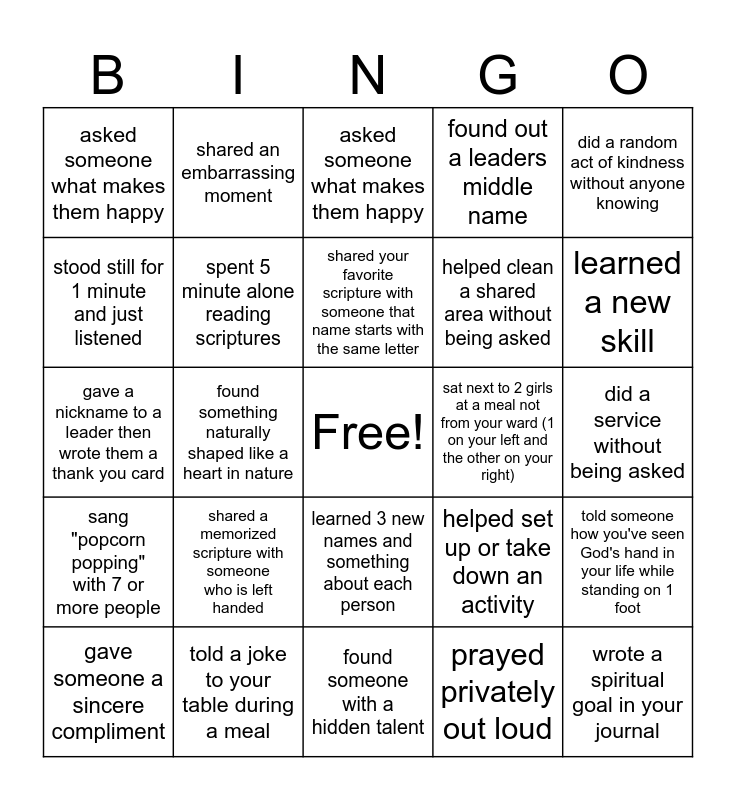 This bingo card has a free space and 29 words: gave someone a sincere compliment, gave a prayer in front of the entire group, found something naturally shaped like a heart in nature, wrote a thank you note to a leader for something specific from their rotation, asked someone what makes them happy, asked someone what makes them happy, spent 5 minute alone reading scriptures, shared a memorized scripture with someone who is left handed, sat next to 2 girls at a meal not from your ward (1 on your left and the other on your right), told a joke to your table during a meal, did a service without being asked, wrote a spiritual goal in your journal, found someone with a hidden talent, prayed privately out loud, learned a new skill, asked a sincere question during a devotional, learned 3 new names and something about each person, sang "popcorn popping" with 7 or more people, did a random act of kindness without anyone knowing, gave a nickname to a leader then wrote them a thank you card, helped set up or take down an activity, invited someone using an accent to join you during an activity, helped clean a shared area without being asked, stood still for 1 minute and just listened, found out a leaders middle name, shared an embarrassing moment, told someone how you've seen God's hand in your life while standing on 1 foot, shared your favorite scripture with someone that name starts with the same letter and filled someone's water bottle for them.