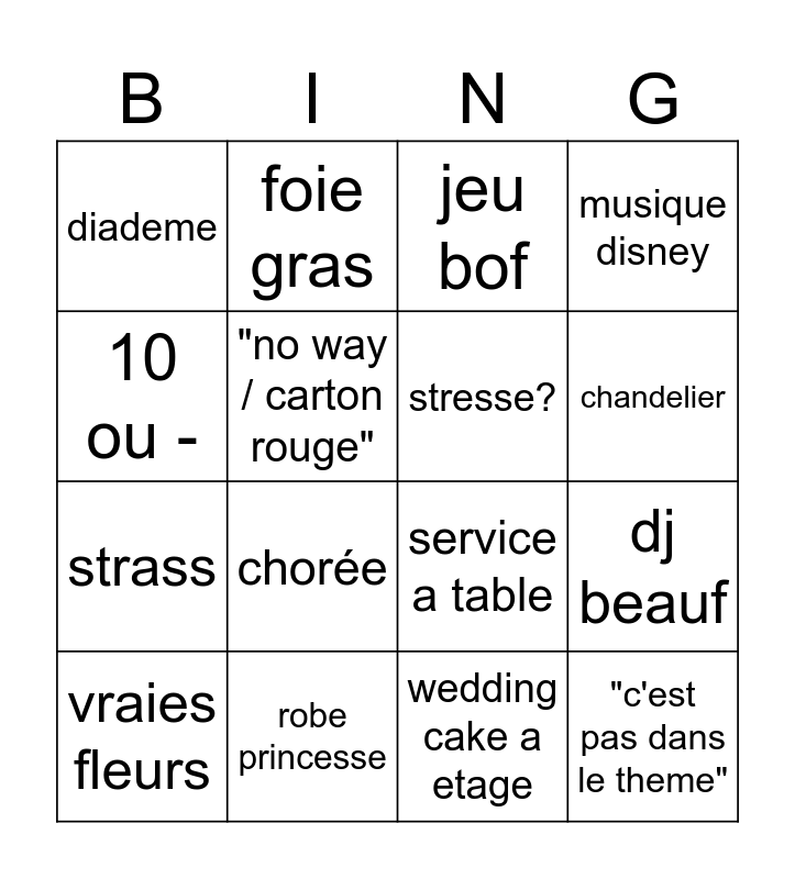 This bingo card has 16 words: robe princesse, dj beauf, jeu bof, diademe, strass, foie gras, service a table, wedding cake a etage, 10 ou -, "no way / carton rouge", vraies fleurs, musique disney, chorée, chandelier, stresse? and "c'est pas dans le theme".