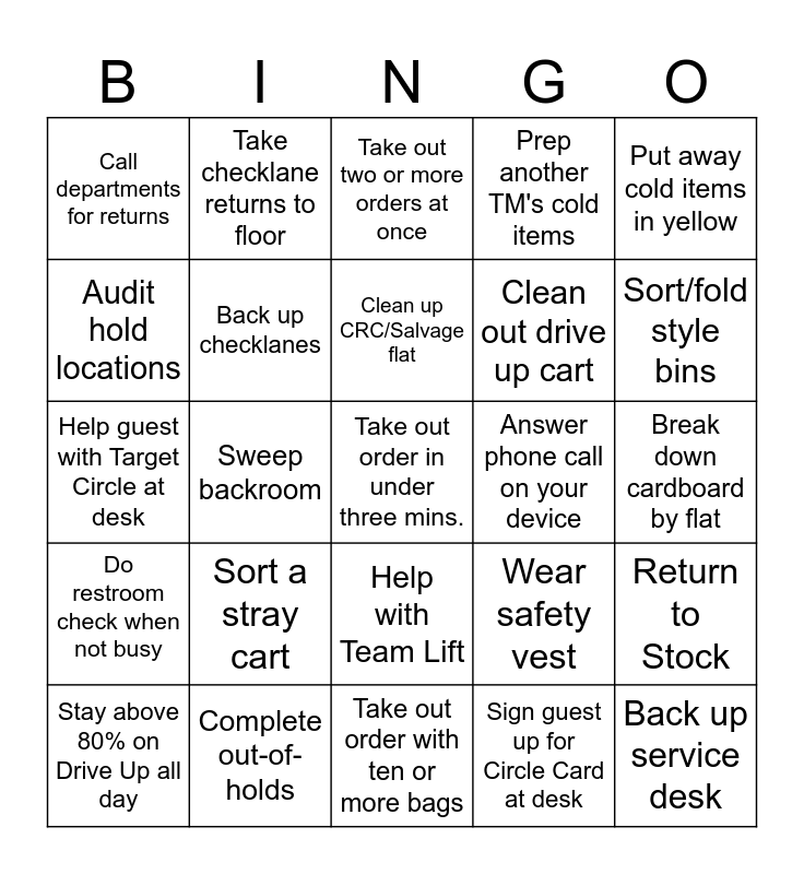 This bingo card has a free space and 24 words: Sort a stray cart, Complete out-of-holds, Clean up CRC/Salvage flat, Stay above 80% on Drive Up all day, Put away cold items in yellow, Call departments for returns, Audit hold locations, Take checklane returns to floor, Answer phone call on your device, Help with Team Lift, Clean out drive up cart, Help guest with Target Circle at desk, Wear safety vest, Return to Stock, Back up checklanes, Sign guest up for Circle Card at desk, Break down cardboard by flat, Take out two or more orders at once, Sort/fold style bins, Sweep backroom, Back up service desk, Do restroom check when not busy, Prep another TM's cold items and Take out order with ten or more bags.