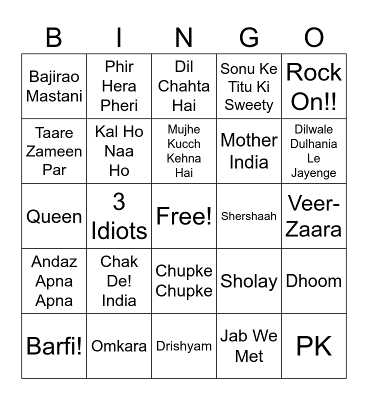 This bingo card has a free space and 29 words: Barfi!, Dangal, 3 Idiots, Zindagi Na Milegi Dobara, Bajirao Mastani, Dil Chahta Hai, Kal Ho Naa Ho, Chak De! India, Shershaah, Omkara, Veer-Zaara, PK, Drishyam, Jab We Met, Dilwale Dulhania Le Jayenge, Bajrangi Bhaijaan, Chupke Chupke, Andaz Apna Apna, Rock On!!, Queen, Sholay, Kabhi Khushi Kabhi Gam, Mother India, Taare Zameen Par, Sonu Ke Titu Ki Sweety, Phir Hera Pheri, Dhoom, Mujhe Kucch Kehna Hai and Yeh Jawaani Hai Deewani.