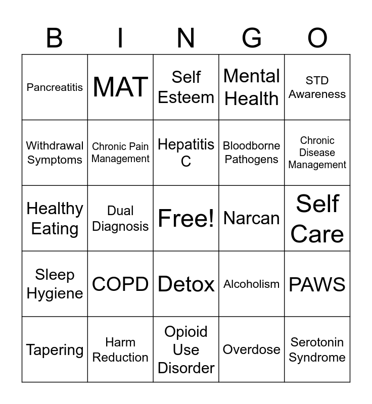 This bingo card has a free space and 24 words: COPD, Harm Reduction, Hepatitis C, Tapering, STD Awareness, Pancreatitis, Withdrawal Symptoms, MAT, Narcan, Detox, Bloodborne Pathogens, Healthy Eating, Alcoholism, PAWS, Chronic Pain Management, Overdose, Self Care, Self Esteem, Chronic Disease Management, Dual Diagnosis, Serotonin Syndrome, Sleep Hygiene, Mental Health and Opioid Use Disorder.