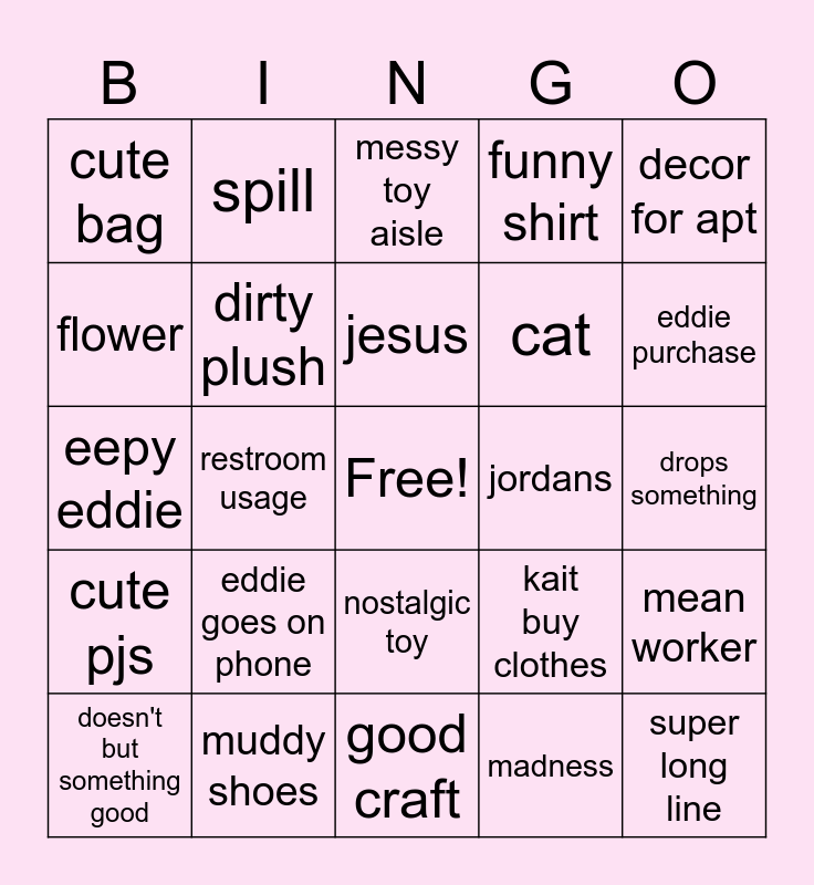This bingo card has a free space and 29 words: doesn't but something good, build-a-bear, restroom usage, good jewelry, cute bag, messy toy aisle, dirty plush, eddie goes on phone, jordans, muddy shoes, drops something, super long line, good craft, madness, eddie purchase, cute skirt, nostalgic toy, cute pjs, decor for apt, eepy eddie, kait buy clothes, kait bored, cat, flower, funny shirt, spill, mean worker, jesus and mean customer.