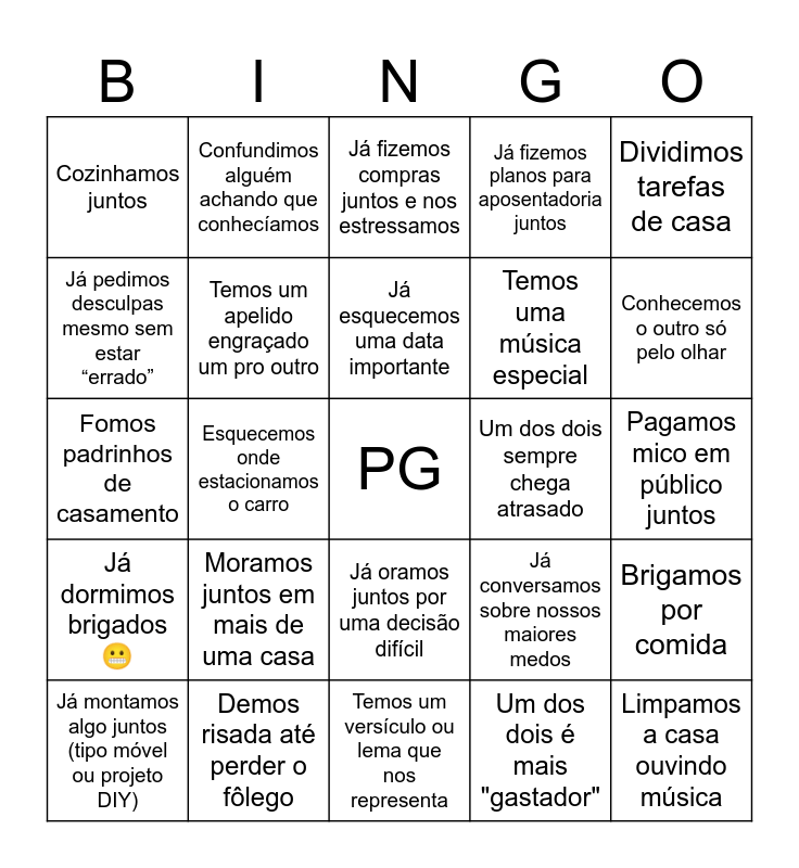 This bingo card has a free space and 62 words: Já choramos juntos, Demos risada até perder o fôlego, Fizemos as pazes no mesmo dia, Já dormimos brigados 😬, Dissemos "eu te amo" hoje, Temos uma piada interna, Temos um apelido engraçado um pro outro, Já fizemos surpresa um pro outro, Temos uma música especial, Já escrevemos bilhetinhos de amor, Já fizemos planos para aposentadoria juntos, Temos uma “tradição” só nossa, Já pedimos desculpas mesmo sem estar “errado”, Já passamos por uma crise e superamos, Já tivemos uma DR que virou piada depois, Cozinhamos juntos, Limpamos a casa ouvindo música, Dividimos tarefas de casa, Um dos dois é mais bagunceiro 😅, Já esquecemos uma data importante, Um dos dois sempre chega atrasado, Já fizemos compras juntos e nos estressamos, Já montamos algo juntos (tipo móvel ou projeto DIY), Um dos dois é mais "gastador", Já perdemos algo importante em casa, Temos um “ritual” antes de dormir, Assistimos séries ou filmes em dupla, Já fizemos dieta juntos, Brigamos por comida, Já fizemos um jantar romântico caseiro, Já viajamos de avião juntos, Fizemos uma road trip, Já nos perdemos durante uma viagem, Já passamos um perrengue na rua, Pagamos mico em público juntos, Confundimos alguém achando que conhecíamos, Rimos em situação errada, Já chegamos atrasados num compromisso importante, Esquecemos onde estacionamos o carro, Já brigamos por causa de GPS ou caminho errado, Fomos padrinhos de casamento, Já participamos de um retiro de casais, Moramos juntos em mais de uma casa, Temos um sonho em comum, Conhecemos o outro só pelo olhar, Já conversamos sobre nossos maiores medos, Já falamos sobre nossos sonhos mais malucos, Temos uma foto antiga que amamos, Já dormimos de conchinha, Temos sinais únicos de carinho, Já oramos juntos por uma decisão difícil, Temos um versículo ou lema que nos representa, Sei dizer o prato favorito do meu cônjuge, Já preparei algo especial só porque ele(a) teve um dia difícil, Sei o que deixa meu cônjuge mais irritado, Já fiz algo só porque sei que ele(a) gosta, mesmo eu não gostando, Sei qual é o maior medo dele(a), Já elogiei meu cônjuge na frente de outras pessoas, Sei qual é o maior sonho dele(a), Conheço um talento escondido dele(a), Já observei algo em silêncio só pra admirar ele(a) and Sei dizer o que faz ele(a) se sentir mais amado(a).