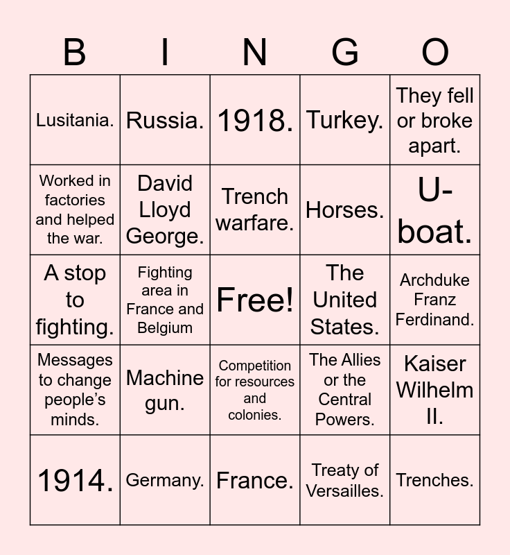 This bingo card has a free space and 24 words: 1914., Machine gun., Trench warfare., Treaty of Versailles., They fell or broke apart., Lusitania., Russia., 1918., The United States., Archduke Franz Ferdinand., A stop to fighting., David Lloyd George., The Allies or the Central Powers., Kaiser Wilhelm II., Worked in factories and helped the war., Germany., France., Turkey., U-boat., Messages to change people’s minds., Fighting area in France and Belgium, Competition for resources and colonies., Horses. and Trenches..