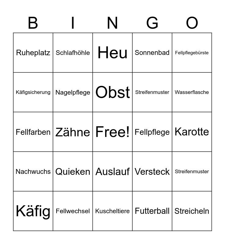 This bingo card has a free space and 29 words: Käfig, Kuscheln, Zähne, Tierarzt, Ruheplatz, Heu, Nagelpflege, Quieken, Fellpflege, Fellwechsel, Karotte, Streicheln, Kuscheltiere, Futterball, Wasserflasche, Futter, Auslauf, Nachwuchs, Fellpflegebürste, Fellfarben, Versteck, Sandbad, Streifenmuster, Käfigsicherung, Sonnenbad, Schlafhöhle, Streifenmuster, Obst and Gemüse.