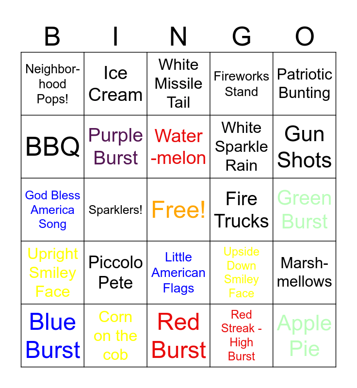 This bingo card has a free space and 24 words: Blue Burst, Piccolo Pete, Water -melon, Red Streak - High Burst, Patriotic Bunting, Neighbor-hood Pops!, Ice Cream, White Missile Tail, Fire Trucks, Green Burst, God Bless America Song, Purple Burst, Upside Down Smiley Face, Marsh-mellows, BBQ, Corn on the cob, Red Burst, Fireworks Stand, Gun Shots, Upright Smiley Face, Sparklers!, Little American Flags, White Sparkle Rain and Apple Pie.