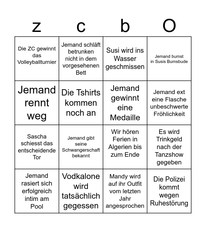 This bingo card has 16 words: Vodkalone wird tatsächlich gegessen, Es wird Trinkgeld nach der Tanzshow gegeben, Susi wird ins Wasser geschmissen, Die ZC gewinnt das Volleyballturnier, Sascha schiesst das entscheidende Tor, Jemand schläft betrunken nicht in dem vorgesehenen Bett, Wir hören Ferien in Algerien bis zum Ende, Mandy wird auf ihr Outfit vom letzten Jahr angesprochen, Jemand rennt weg, Die Tshirts kommen noch an, Jemand rasiert sich erfolgreich intim am Pool, Jemand bumst in Susis Bumsbude, Jemand gibt seine Schwangerschaft bekannt, Jemand ext eine Flasche unbeschwerte Fröhlichkeit, Jemand gewinnt eine Medaille and Die Polizei kommt wegen Ruhestörung.