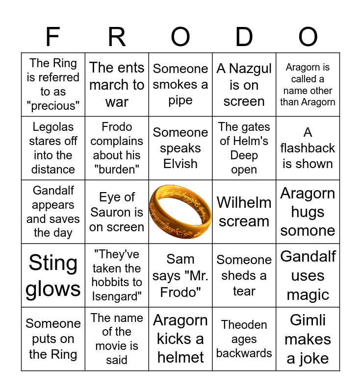 This bingo card has a free space and 35 words: Merry and Pippin do something dumb, Legolas and Gimli share a bro moment, Close up shot of the Ring, Frodo complains about his "burden", Sam says "Mr. Frodo", A Nazgul is on screen, Legolas stares off into the distance, Sweeping New Zealand tourism shot, Someone speaks Elvish, A main character dies, Gandalf appears and saves the day, Aragorn is called a name other than Aragorn, Someone sings, Someone eats, The Ring is referred to as "precious", Wilhelm scream, Theoden ages backwards, Eye of Sauron is on screen, Sting glows, Gimli makes a joke, Someone sheds a tear, Someone puts on the Ring, Gandalf uses magic, The name of the movie is said, Someone smokes a pipe, A flashback is shown, Orcs attack, Smeagol and Gollum argue, The gates of Helm's Deep open, Aragorn hugs somone, "You've got to toss me", Aragorn kicks a helmet, "They've taken the hobbits to Isengard", The ents march to war and Nasty orc birth.