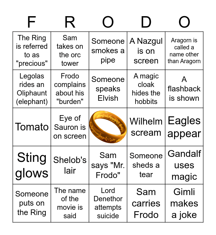 This bingo card has a free space and 35 words: Merry and Pippin do something dumb, Legolas and Gimli share a bro moment, Close up shot of the Ring, Frodo complains about his "burden", Sam says "Mr. Frodo", A Nazgul is on screen, Legolas rides an Oliphaunt (elephant), Sweeping New Zealand tourism shot, Someone speaks Elvish, A main character dies, Tomato, Aragorn is called a name other than Aragorn, Someone sings, Someone eats, The Ring is referred to as "precious", Wilhelm scream, Sam carries Frodo, Eye of Sauron is on screen, Sting glows, Gimli makes a joke, Someone sheds a tear, Someone puts on the Ring, Gandalf uses magic, The name of the movie is said, Someone smokes a pipe, A flashback is shown, Orcs attack, Smeagol and Gollum argue, A magic cloak hides the hobbits, Eagles appear, "I am no man", Lord Denethor attempts suicide, Shelob's lair, Sam takes on the orc tower and "For Frodo".