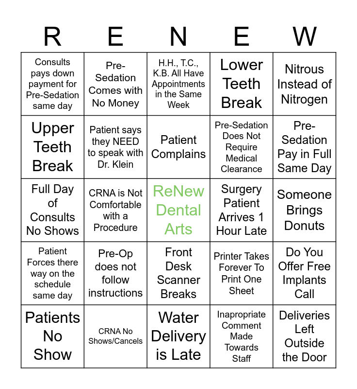 This bingo card has a free space and 24 words: Pre-Op does not follow instructions, CRNA No Shows/Cancels, Patient Complains, Patients No Show, Nitrous Instead of Nitrogen, Consults pays down payment for Pre-Sedation same day, Upper Teeth Break, Pre-Sedation Comes with No Money, Surgery Patient Arrives 1 Hour Late, Front Desk Scanner Breaks, Pre-Sedation Does Not Require Medical Clearance, Full Day of Consults No Shows, Printer Takes Forever To Print One Sheet, Do You Offer Free Implants Call, Patient says they NEED to speak with Dr. Klein, Inapropriate Comment Made Towards Staff, Someone Brings Donuts, H.H., T.C., K.B. All Have Appointments in the Same Week, Pre-Sedation Pay in Full Same Day, CRNA is Not Comfortable with a Procedure, Deliveries Left Outside the Door, Patient Forces there way on the schedule same day, Lower Teeth Break and Water Delivery is Late.