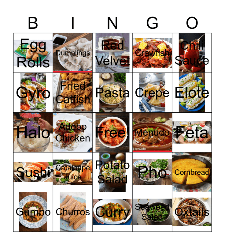This bingo card has 24 images, a free space and 24 words: Gumbo, Cataloupe Juice, Pasta, Seaweed Salad, Chili Sauce, Egg Rolls, Dumplings, Red Velvet, Menudo, Feta, Halo, Fried Catfish, Pho, Cornbread, Gyro, Churros, Curry, Crawfish, Elote, Sushi, Adobo Chicken, Potato Salad, Crepe and Oxtails.