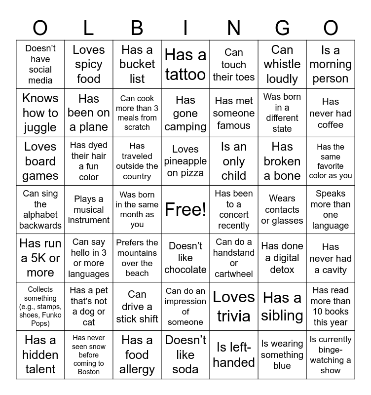 This bingo card has a free space and 49 words: Has a sibling, Was born in a different state, Is left-handed, Plays a musical instrument, Has traveled outside the country, Speaks more than one language, Loves spicy food, Has a food allergy, Can whistle loudly, Doesn’t like chocolate, Is a morning person, Has a tattoo, Has broken a bone, Is an only child, Has a pet that’s not a dog or cat, Wears contacts or glasses, Knows how to juggle, Has never had coffee, Has read more than 10 books this year, Can touch their toes, Has met someone famous, Was born in the same month as you, Doesn’t have social media, Has been on a plane, Has a hidden talent, Can cook more than 3 meals from scratch, Has the same favorite color as you, Has never seen snow before coming to Boston, Loves pineapple on pizza, Has dyed their hair a fun color, Can recite a movie quote by heart, Has been to a concert recently, Collects something (e.g., stamps, shoes, Funko Pops), Can drive a stick shift, Can sing the alphabet backwards, Can do a handstand or cartwheel, Has done a digital detox, Has never had a cavity, Loves board games, Prefers the mountains over the beach, Can do an impression of someone, Has run a 5K or more, Is currently binge-watching a show, Doesn’t like soda, Has gone camping, Has a bucket list, Loves trivia, Can say hello in 3 or more languages and Is wearing something blue.
