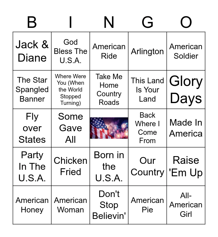This bingo card has a free space and 43 words: All Summer Long, All-American Girl, American Heart, American Honey, American Kids, American Pie, American Ride, American Saturday Night, American Soldier, American Woman, Arlington, Back Where I Come From, Born in the U.S.A., Chicken Fried, Courtesy Of The Red White And Blue (The Angry American), Don't Stop Believin', Firework, Fly over States, Free Bird, Glory Days, God Bless The U.S.A., Independence Day, It’s America, Jack & Diane, Letters from Home, Made In America, Mr Red White and Blue, Only in America, Our Country, Party In The U.S.A., R.O.C.K. In The U.S.A., Raise 'Em Up, Riding With Private Malone, Some Gave All, Song of the South, Surfin' U.S.A., Sweet Home Alabama, Take Me Home Country Roads, The Star Spangled Banner, This Land Is Your Land, Where The Stars And Stripes And The Eagle Fly, Where Were You (When the World Stopped Turning) and You've Got to Stand for Something.