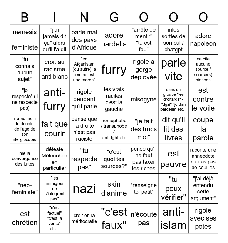This bingo card has a free space and 48 words: "renseigne toi petit", parle vite, "c'est faux", fait que courir, rigole pendant qu'il parle, coupe la parole, "j'ai jamais dit ça" alors qu'il l'a dit, "c'est factuel" "c'est la vérité" etc..., infos sorties de son cul / chatgpt, "c'est quoi tes sources?", adore napoleon, adore bardella, dans un groupe "les droitards" - "dgsi" "jordan bardella" etc..., misogyne, "neo-feministe", dit qu'il lit des livres, "tu connais aucun sujet", ne cite aucune source / source(s) biasées, "tu peux vérifier", "arrête de mentir" "tu est fou", rigole a gorge déployée, pense que la droite n'est pas raciste, nemesis = feministe, croit au racisme anti blanc, "j'ai déjà entendu cette argument", "en Afganistan (ou autre) la femme est une merde", est contre le voile, est chrétien, les vrais racites c'est la gauche, anti-furry, anti-islam, "je fait des trucs moi", raconte une annecdote ou il as pas de couilles, "les immigrés ne s'integrent pas", il a au moin le double de l'age de son interglocuteur, pense qu'il ne faut pas taxer les riches, est pauvre, "je respecte" (il ne respecte pas), "tu respecte pas", nazi, nie la convergence des luttes, rigole avec ses potes, parle mal des pays d'Afrique, croit en la méritocratie, furry, skin d'anime, déteste Mélenchon en particulier and n'écoute pas.