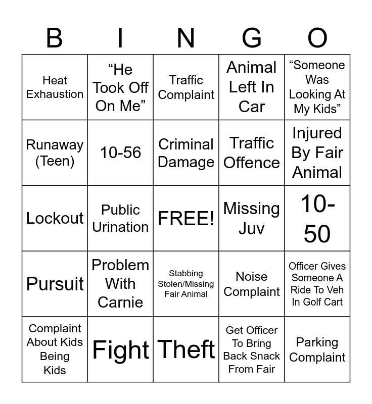 This bingo card has a free space and 24 words: Problem With Carnie, Fight, Criminal Damage, Complaint About Kids Being Kids, “Someone Was Looking At My Kids”, Heat Exhaustion, Runaway (Teen), “He Took Off On Me”, Missing Juv, Stabbing Stolen/Missing Fair Animal, Traffic Offence, Lockout, Noise Complaint, Officer Gives Someone A Ride To Veh In Golf Cart, 10-56, Get Officer To Bring Back Snack From Fair, 10-50, Traffic Complaint, Injured By Fair Animal, Public Urination, Parking Complaint, Pursuit, Animal Left In Car and Theft.