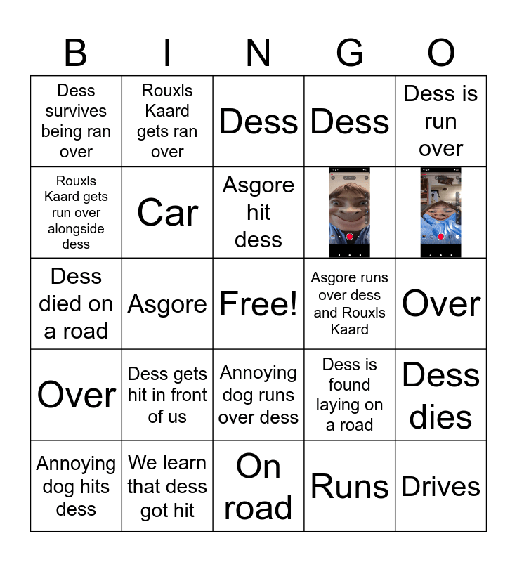 This bingo card has 2 images, a free space and 22 words: Dess gets hit in front of us, We learn that dess got hit, Asgore hit dess, Annoying dog hits dess, Dess is run over, Dess survives being ran over, Rouxls Kaard gets run over alongside dess, Rouxls Kaard gets ran over, Asgore runs over dess and Rouxls Kaard, Annoying dog runs over dess, Dess died on a road, Dess is found laying on a road, Dess dies, Car, Runs, Over, Dess, Asgore, Drives, Over, Dess and On road.
