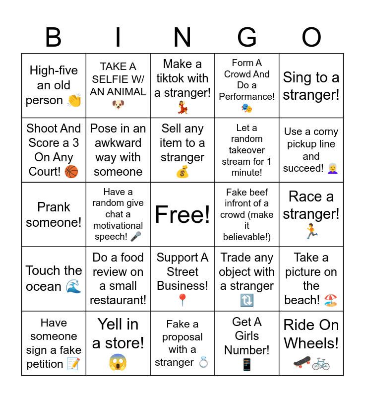 This bingo card has a free space and 24 words: Have someone sign a fake petition 📝, Do a food review on a small restaurant!, Sell any item to a stranger 💰, Get A Girls Number! 📱, Sing to a stranger!, High-five an old person 👏, TAKE A SELFIE W/ AN ANIMAL 🐶, Make a tiktok with a stranger! 💃, Fake beef infront of a crowd (make it believable!), Race a stranger! 🏃, Prank someone!, Pose in an awkward way with someone, Trade any object with a stranger 🔃, Take a picture on the beach! 🏖️, Shoot And Score a 3 On Any Court! 🏀, Yell in a store! 😱, Fake a proposal with a stranger 💍, Form A Crowd And Do a Performance! 🎭, Use a corny pickup line and succeed! 👩🦳, Touch the ocean 🌊, Have a random give chat a motivational speech! 🎤, Support A Street Business! 📍, Let a random takeover stream for 1 minute! and Ride On Wheels!🛹🚲.