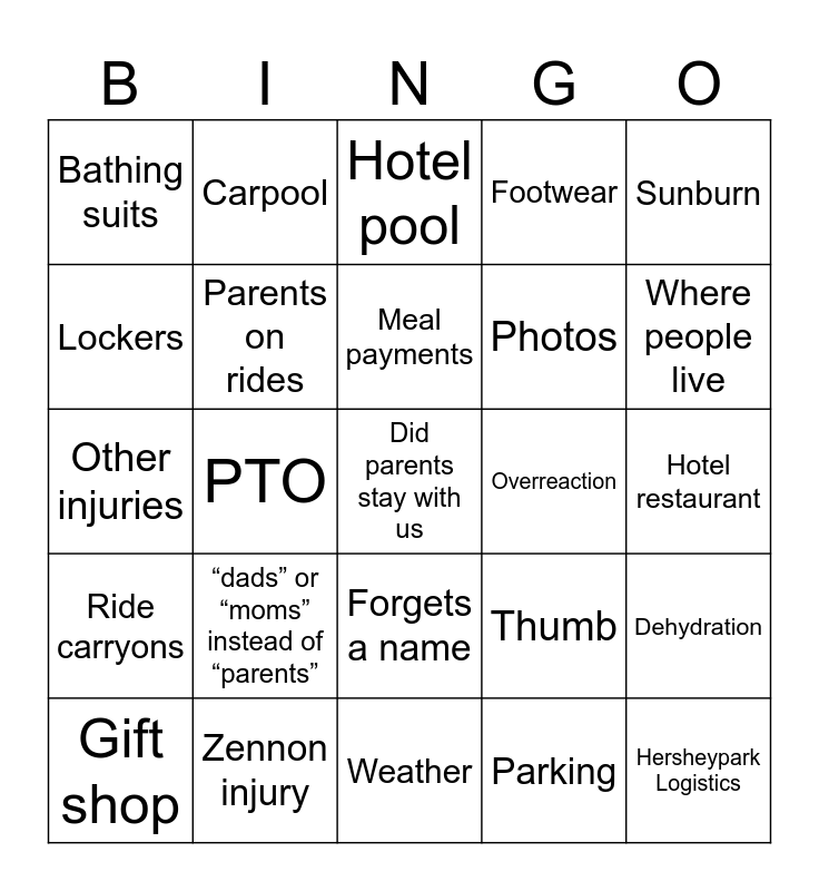 This bingo card has 25 words: “dads” or “moms” instead of “parents”, Weather, Meal payments, Gift shop, Sunburn, Bathing suits, Lockers, Carpool, Overreaction, Forgets a name, Photos, Other injuries, Thumb, Dehydration, Parents on rides, Hersheypark Logistics, Hotel restaurant, Hotel pool, Where people live, PTO, Did parents stay with us, Zennon injury, Ride carryons, Footwear and Parking.