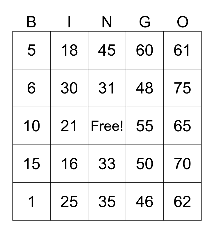 This bingo card has a free space and 24 words: 1, 16, 31, 46, 61, 5, 18, 45, 55, 65, 10, 30, 50, 70, 6, 25, 35, 60, 75, 15, 21, 33, 48 and 62.