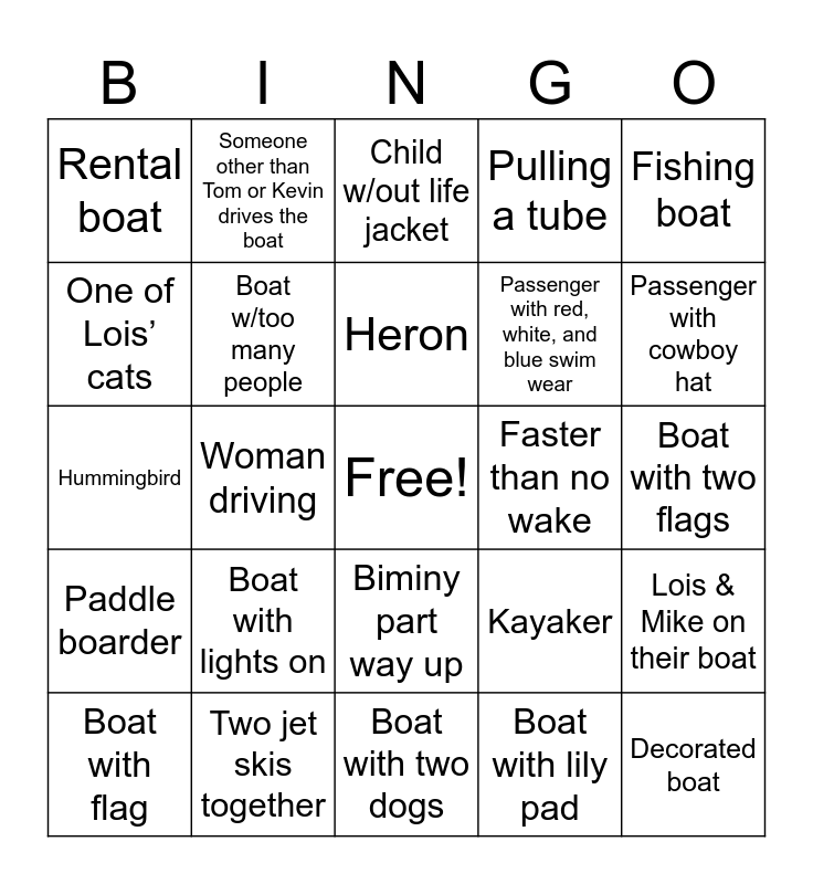 This bingo card has a free space and 29 words: Boat with flag, Boat with music, Woman driving, Boat with bumpers, Rental boat, Child w/out life jacket, Boat w/too many people, Boat with lights on, Faster than no wake, Two jet skis together, Boat with two flags, Decorated boat, Boat with two dogs, Boat with lily pad, Passenger with cowboy hat, Struggles to turn around, Biminy part way up, Paddle boarder, Fishing boat, Hummingbird, Kayaker, Someone catches a fish, Passenger with red, white, and blue swim wear, One of Lois’ cats, Pulling a tube, Someone other than Tom or Kevin drives the boat, Lois & Mike on their boat, Heron and Pontoon boat w/only two people.