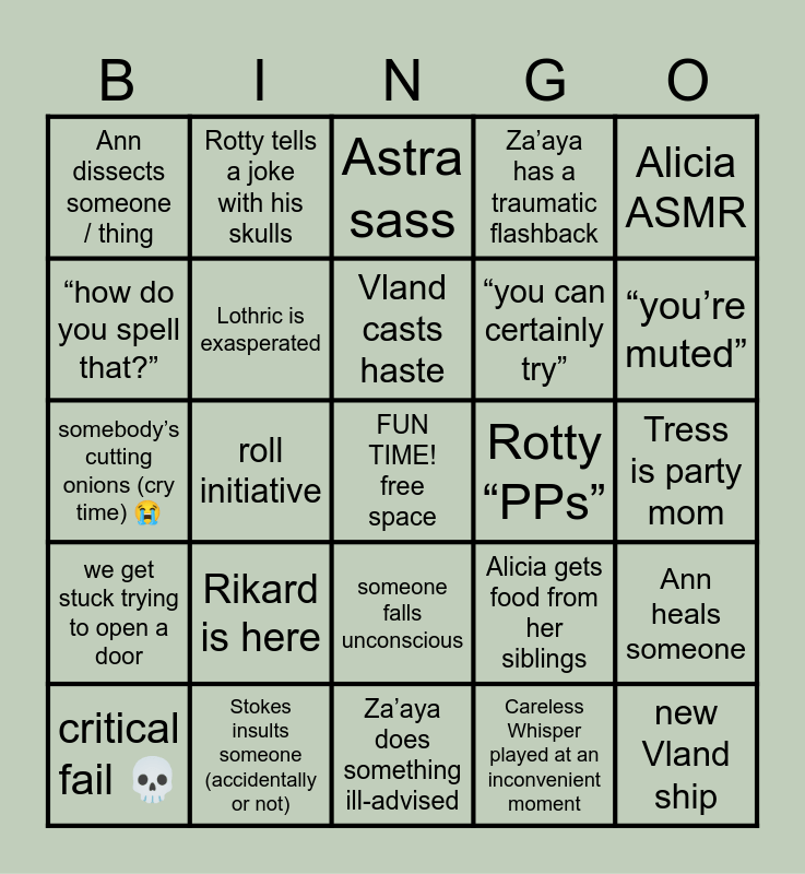 This bingo card has a free space and 29 words: critical fail 💀, NATURAL 20 🎉, roll initiative, Alec sad boi hours, Ann dissects someone / thing, Astra sass, Lothric is exasperated, Rikard is here, Rotty “PPs”, Stokes insults someone (accidentally or not), Tress is party mom, new Vland ship, Za’aya does something ill-advised, Careless Whisper played at an inconvenient moment, “you’re muted”, “that’s what she said”, someone falls unconscious, we get stuck trying to open a door, Alicia ASMR, somebody’s cutting onions (cry time) 😭, Alicia gets food from her siblings, we split the party, “you can certainly try”, “how do you spell that?”, Za’aya has a traumatic flashback, Rotty tells a joke with his skulls, Ann heals someone, Vland casts haste and captain / general / major salute.