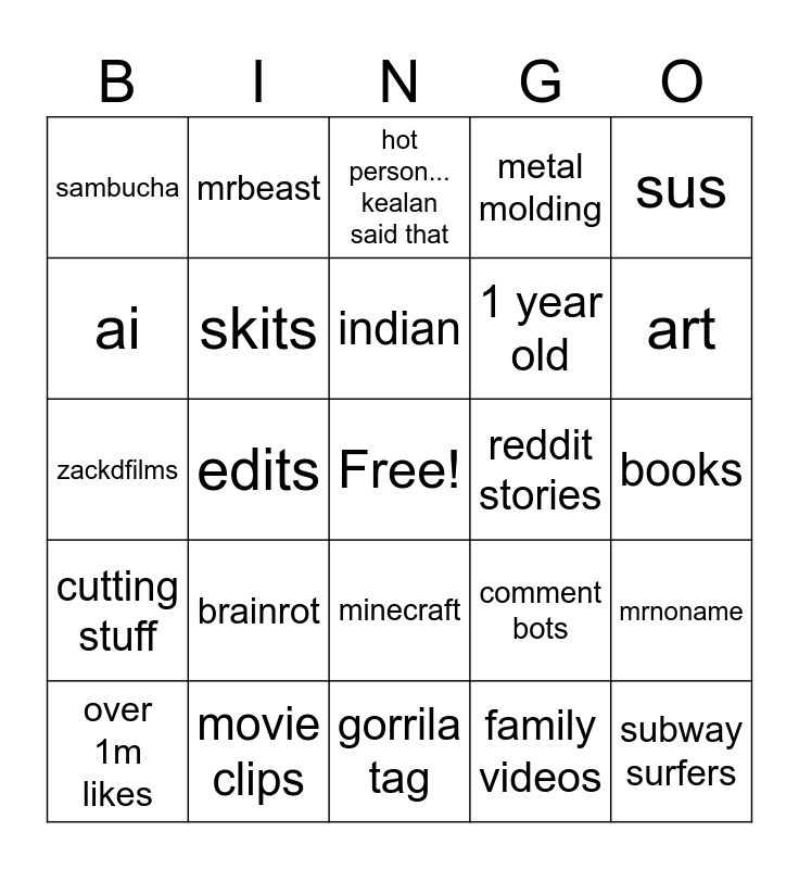 This bingo card has a free space and 24 words: brainrot, movie clips, indian, over 1m likes, sus, sambucha, ai, mrbeast, reddit stories, minecraft, 1 year old, zackdfilms, comment bots, mrnoname, skits, family videos, books, hot person... kealan said that, art, edits, subway surfers, cutting stuff, metal molding and gorrila tag.
