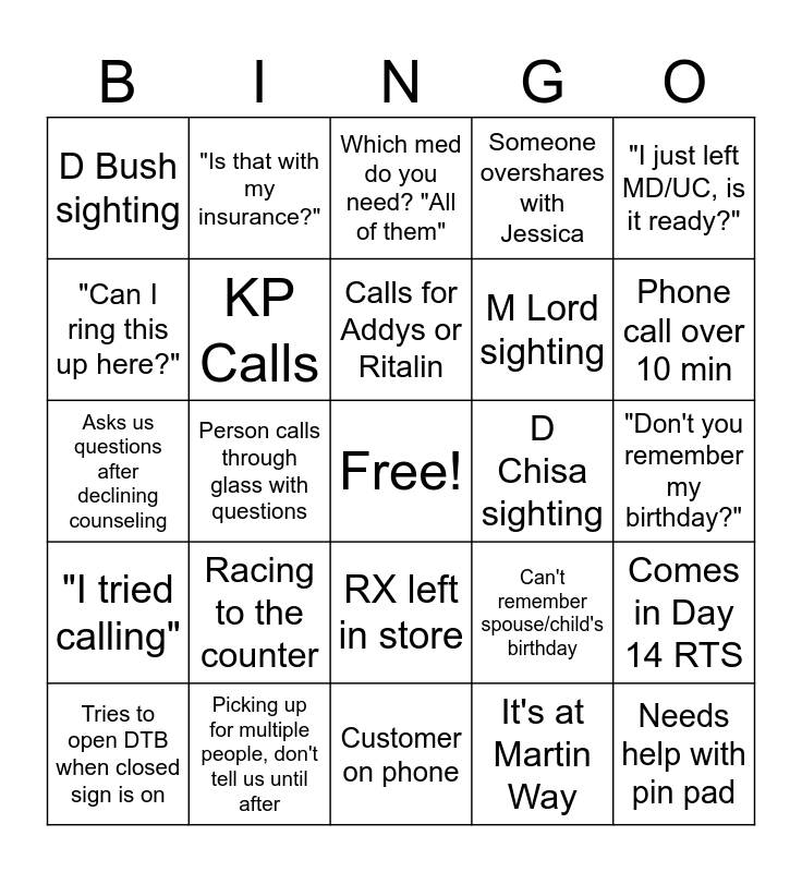 This bingo card has a free space and 34 words: "Text says it's ready" It's time to refill, It's at Martin Way, Side Quest, Needs help with DTB, "I tried calling", KP Calls, "I just left MD/UC, is it ready?", Tries to open DTB when closed sign is on, "Is that with my insurance?", Stephen email, Calls for Addys or Ritalin, Which med do you need? "All of them", "I'm going out of town and I need it", Asks us where the bathroom is, D Chisa sighting, Phone call over 10 min, Picking up for multiple people, don't tell us until after, Asks us questions after declining counseling, Racing to the counter, Can't remember spouse/child's birthday, RX left in store, No hello, just birthday, D Bush sighting, "Don't you remember my birthday?", Customer on phone, Needs help with pin pad, Someone overshares with Jessica, Comes in 2 min before lunch or closing, M Lord sighting, "Can I ring this up here?", Molina WAG transfer, Person calls through glass with questions, Comes in Day 14 RTS and "I've never paid that much before".