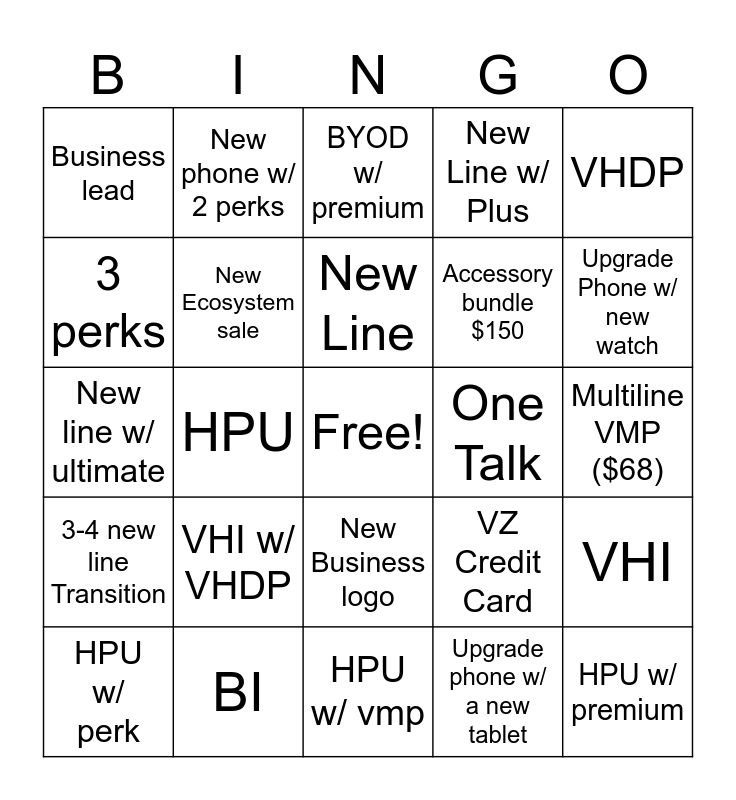This bingo card has a free space and 24 words: HPU w/ perk, VHI w/ VHDP, New Line, Upgrade phone w/ a new tablet, VHDP, Business lead, New phone w/ 2 perks, BYOD w/ premium, One Talk, Multiline VMP ($68), New line w/ ultimate, New Ecosystem sale, VZ Credit Card, VHI, 3 perks, BI, HPU w/ vmp, New Line w/ Plus, Upgrade Phone w/ new watch, 3-4 new line Transition, HPU, New Business logo, Accessory bundle $150 and HPU w/ premium.