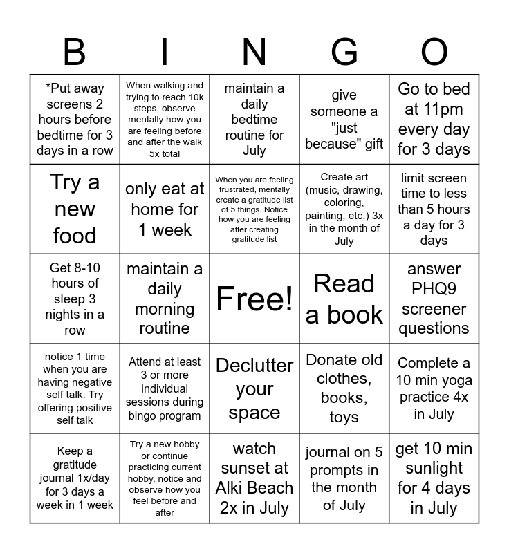 This bingo card has a free space and 24 words: Attend at least 3 or more individual sessions during bingo program, Try a new hobby or continue practicing current hobby, notice and observe how you feel before and after, When you are feeling frustrated, mentally create a gratitude list of 5 things. Notice how you are feeling after creating gratitude list, Keep a gratitude journal 1x/day for 3 days a week in 1 week, Go to bed at 11pm every day for 3 days, *Put away screens 2 hours before bedtime for 3 days in a row, Try a new food, When walking and trying to reach 10k steps, observe mentally how you are feeling before and after the walk 5x total, Read a book, Declutter your space, Create art (music, drawing, coloring, painting, etc.) 3x in the month of July, Get 8-10 hours of sleep 3 nights in a row, Donate old clothes, books, toys, Complete a 10 min yoga practice 4x in July, only eat at home for 1 week, journal on 5 prompts in the month of July, answer PHQ9 screener questions, maintain a daily bedtime routine for July, limit screen time to less than 5 hours a day for 3 days, maintain a daily morning routine, get 10 min sunlight for 4 days in July, notice 1 time when you are having negative self talk. Try offering positive self talk, give someone a "just because" gift and watch sunset at Alki Beach 2x in July.