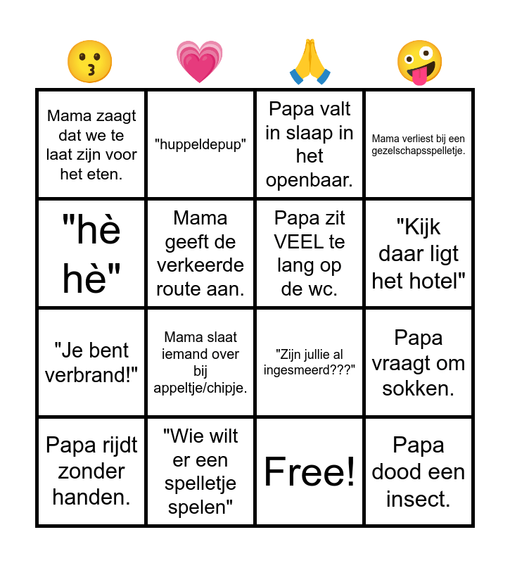 This bingo card has 17 words: Free!, Papa rijdt zonder handen., Papa valt in slaap in het openbaar., Mama zaagt dat we te laat zijn voor het eten., Mama slaat iemand over bij appeltje/chipje., Mama verliest bij een gezelschapsspelletje., Papa vraagt om sokken., Papa zit VEEL te lang op de wc., "Kijk daar ligt het hotel", Mama geeft de verkeerde route aan., "Wie wilt er een spelletje spelen", "Zijn jullie al ingesmeerd???", "hè hè", "huppeldepup", "Je bent verbrand!", "Heb jij voor morgen een lunchpakket nodig?" and Papa dood een insect..