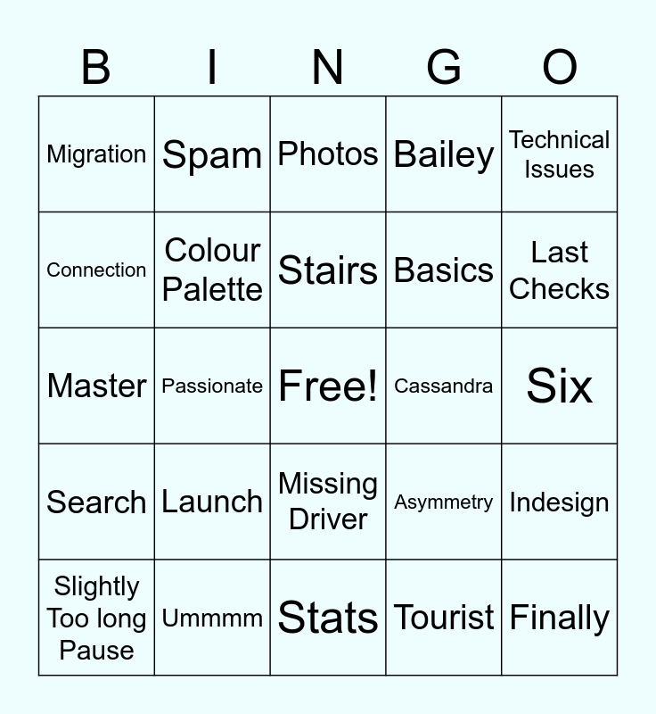 This bingo card has a free space and 24 words: Slightly Too long Pause, Launch, Stairs, Tourist, Technical Issues, Migration, Spam, Photos, Cassandra, Six, Master, Colour Palette, Asymmetry, Indesign, Connection, Ummmm, Stats, Bailey, Last Checks, Search, Passionate, Missing Driver, Basics and Finally.