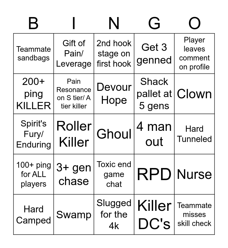 This bingo card has a free space and 27 words: RPD, Blood Favor, Shack pallet at 5 gens, Slugged for the 4k, 200+ ping KILLER, 2nd hook stage on first hook, Gift of Pain/ Leverage, 100+ ping for ALL players, 4 man out, Nurse, Spirit's Fury/ Enduring, Get 3 genned, Hard Camped, Swamp, Clown, Midwich, Pain Resonance on S tier/ A tier killer, Devour Hope, 3+ gen chase, Teammate sandbags, Hard Tunneled, Killer DC's, Roller Killer, Teammate misses skill check, Toxic end game chat, Player leaves comment on profile and Grim Embrace / Dead Man's Switch.