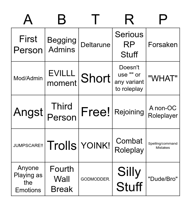 This bingo card has a free space and 67 words: () or //, Brainrot, Radio, Spelling/command Mistakes, Flight, Misnamed, Begging Admins, Dark Topics, Short, Tall, YOINK!, Server Admin, A non-OC Roleplayer, Forsaken, Developer+, Mod/Admin, Third Person, First Person, Any Args, Doesn't use "" or any variant to roleplay, Trolls, JUMPSCARE!!, Serious RP Stuff, Silly Stuff, "HELP?", "HUH??", "...", "Wuh/Weh", "WHAT", "./-", "Dude/Bro", Donation in Chat, Somebody forgetting to switch IC/OOC in nametag, Glitches, Emoticons/Emojis, Anyone Playing as the Emotions, Turn-Based Fights, Combat Roleplay, Angst, Therapy, Language other than English, EVILLL moment, Rejoining, Friend Request, A morph you don't see often, ✨ Trauma ✨, Mentions of a SFOTH, Fourth Wall Break, /j, A reference, Deltarune, Announcement Spam, Server Admin Abuse, Someone mistaken a server admin as a mod/etc, Morph Abuse, GODMODDER., A censored swear., A server admin hosting an event, Someone playing as a shopkeeper, Anything spooky based, Roblox Myths, Roblox Admins, Crowding, Hair Tufts, Confusion Dialogue ("???"/"...?"), Sudden Attacking and Spamming Items.