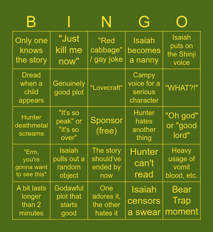 This bingo card has a free space and 34 words: "Is something funny, Hunter?", Isaiah censors a swear, Eckspecially, One of them crashes out, "Erm, you're gonna want to see this", Genuinely good plot, Isaiah puts on the Shinji voice, A bit lasts longer than 2 minutes, "Just kill me now", Hunter puts on a campy voice, "Lovecraft", "Red cabbage" / gay joke, Talking over eachother, Child abuse or kiddie diddlers, Hunter hates another thing, "WHAT?!", Godawful plot that starts good, Hunter deathmetal screams, Isaiah pulls out a random object, Hunter can't read, The story should've ended by now, Making up new characters, Only one knows the story, "Oh god" or "good lord", One adores it, the other hates it, Bear Trap moment, Isaiah becomes a nanny, Jeff goldblum voice, Campy voice for a serious character, Dread when a child appears, Dread of a "NSFW" chaper, "It's so peak" or "it's so over", Heavy usage of vomit blood, etc. and Body horror.