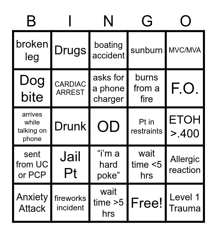 This bingo card has 30 words: fireworks incident, left AMA, Drunk, Police brought in, broken leg, boating accident, CARDIAC ARREST, “i’m a hard poke”, Pt in restraints, wait time >5 hrs, ETOH >.400, OD, Free!, Level 1 Trauma, F.O., wants a sandwich but 🤮, wait time <5 hrs, sent from UC or PCP, Jail Pt, MVC/MVA, arrives while talking on phone, “i need ultrasound”, Drugs, burns from a fire, Dog bite, sunburn, Allergic reaction, Anxiety Attack, asks for a phone charger and Angry family member.