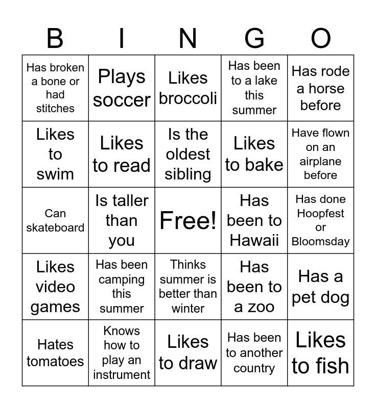 This bingo card has a free space and 24 words: Hates tomatoes, Has been camping this summer, Is the oldest sibling, Has been to another country, Has rode a horse before, Has broken a bone or had stitches, Plays soccer, Likes broccoli, Has been to Hawaii, Has done Hoopfest or Bloomsday, Can skateboard, Likes to read, Has been to a zoo, Has a pet dog, Likes to swim, Knows how to play an instrument, Likes to draw, Has been to a lake this summer, Have flown on an airplane before, Likes video games, Is taller than you, Thinks summer is better than winter, Likes to bake and Likes to fish.