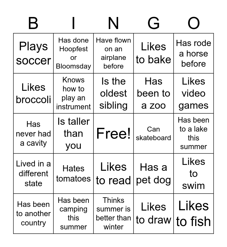 This bingo card has a free space and 24 words: Hates tomatoes, Has been camping this summer, Is the oldest sibling, Has been to another country, Has rode a horse before, Plays soccer, Likes broccoli, Has done Hoopfest or Bloomsday, Can skateboard, Likes to read, Has been to a zoo, Has never had a cavity, Has a pet dog, Likes to swim, Knows how to play an instrument, Likes to draw, Has been to a lake this summer, Have flown on an airplane before, Likes video games, Is taller than you, Likes to fish, Lived in a different state, Likes to bake and Thinks summer is better than winter.