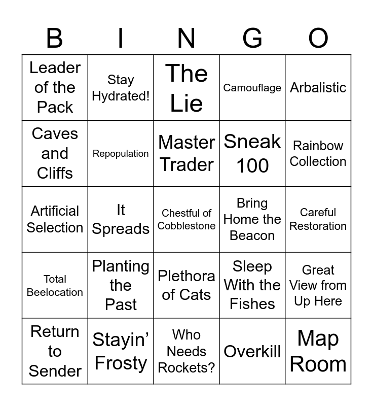 This bingo card has a free space and 24 words: Planting the Past, Stayin’ Frosty, Master Trader, Return to Sender, Arbalistic, Leader of the Pack, Caves and Cliffs, Stay Hydrated!, Bring Home the Beacon, Plethora of Cats, Sneak 100, Artificial Selection, Sleep With the Fishes, Great View from Up Here, Repopulation, Overkill, Careful Restoration, The Lie, Rainbow Collection, It Spreads, Map Room, Total Beelocation, Camouflage and Who Needs Rockets?.
