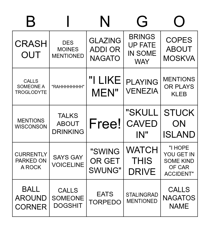 This bingo card has a free space and 24 words: SAYS GAY VOICELINE, CALLS SOMEONE DOGSHIT, "I LIKE MEN", BALL AROUND CORNER, COPES ABOUT MOSKVA, CRASH OUT, CALLS SOMEONE A TROGLODYTE, DES MOINES MENTIONED, "SKULL CAVED IN", "SWING OR GET SWUNG", PLAYING VENEZIA, MENTIONS WISCONSON, WATCH THIS DRIVE, "I HOPE YOU GET IN SOME KIND OF CAR ACCIDENT", "RAHHHHHHHH", STALINGRAD MENTIONED, STUCK ON ISLAND, GLAZING ADDI OR NAGATO, MENTIONS OR PLAYS KLEB, TALKS ABOUT DRINKING, CALLS NAGATOS NAME, CURRENTLY PARKED ON A ROCK, BRINGS UP FATE IN SOME WAY and EATS TORPEDO.