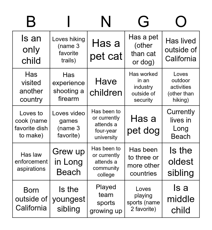 This bingo card has 25 words: Grew up in Long Beach, Played team sports growing up, Have children, Born outside of California, Has lived outside of California, Is an only child, Has visited another country, Loves hiking (name 3 favorite trails), Has a pet dog, Has been to or currently attends a community college, Has worked in an industry outside of security, Loves to cook (name favorite dish to make), Has been to three or more other countries, Is the oldest sibling, Has experience shooting a firearm, Is a middle child, Currently lives in Long Beach, Has a pet cat, Loves outdoor activities (other than hiking), Loves video games (name 3 favorite), Has been to or currently attends a four-year university, Is the youngest sibling, Has law enforcement aspirations, Has a pet (other than cat or dog) and Loves playing sports (name 2 favorite).