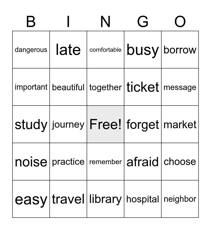 This bingo card has a free space and 30 words: travel, weather, journey, breakfast, dangerous, comfortable, beautiful, remember, forget, library, market, neighbor, hospital, vacation, message, invite, afraid, noise, practice, borrow, study, arrive, late, ticket, important, busy, choose, easy, together and answer.