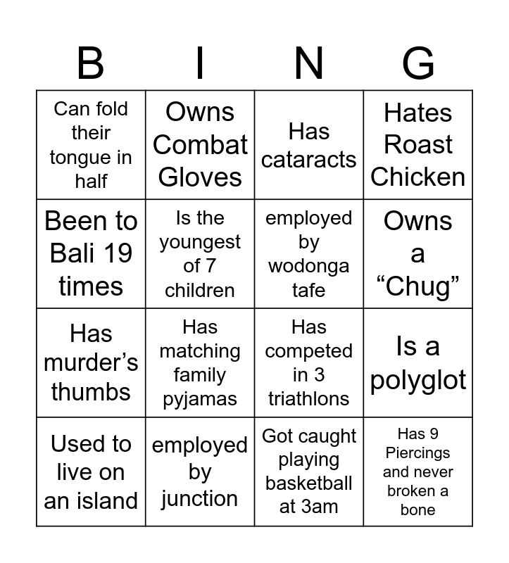 This bingo card has 26 words: Free!, Studies Neuroscience, Owns a “Chug”, Owns an emu called ‘Peanut’, Been to Bali 19 times, Can fold their tongue in half, Is the youngest of 7 children, Owns Combat Gloves, Got caught playing basketball at 3am, Has a metal fashion sense, Has murder’s thumbs, Has competed in 3 triathlons, Was in a movie ad for their school, Likes Cold Baked Beans, Is a polyglot, Favourite Dinosaur is a Parasaurolophus, Hates Roast Chicken, Has 9 Piercings and never broken a bone, Has cataracts, Used to live on an island, Has matching family pyjamas, Travelled to Malta, employed by junction, employed by bsl, employed by wodonga tafe and employed by beyond housing.
