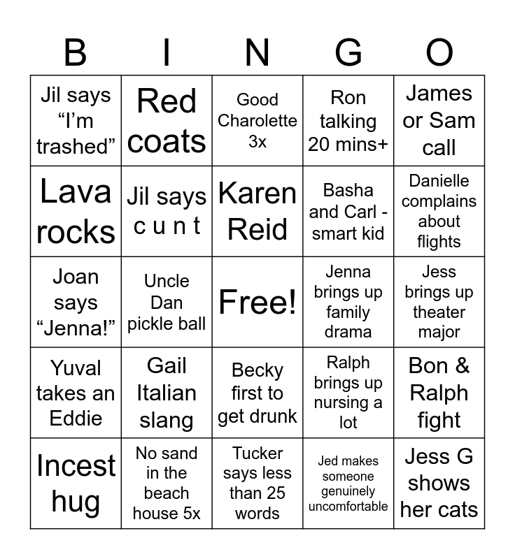 This bingo card has a free space and 24 words: Gail Italian slang, No sand in the beach house 5x, Karen Reid, Incest hug, James or Sam call, Jil says “I’m trashed”, Lava rocks, Red coats, Jenna brings up family drama, Becky first to get drunk, Basha and Carl - smart kid, Joan says “Jenna!”, Ralph brings up nursing a lot, Bon & Ralph fight, Jil says c u n t, Jed makes someone genuinely uncomfortable, Jess brings up theater major, Good Charolette 3x, Danielle complains about flights, Uncle Dan pickle ball, Jess G shows her cats, Yuval takes an Eddie, Ron talking 20 mins+ and Tucker says less than 25 words.