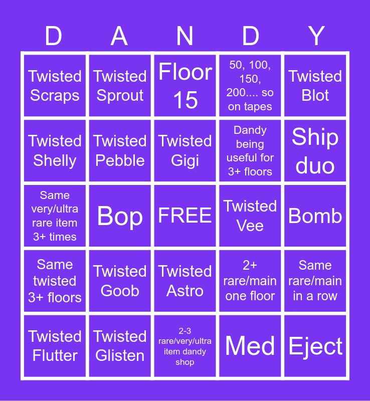 This bingo card has a free space and 24 words: Twisted Goob, Twisted Glisten, Twisted Gigi, Twisted Flutter, Twisted Blot, Twisted Scraps, Twisted Shelly, Twisted Sprout, Twisted Vee, Twisted Astro, Dandy being useful for 3+ floors, Same very/ultra rare item 3+ times, 2+ rare/main one floor, Same rare/main in a row, Twisted Pebble, Med, Bomb, Floor 15, Ship duo, Bop, Eject, Same twisted 3+ floors, 50, 100, 150, 200.... so on tapes and 2-3 rare/very/ultra item dandy shop.