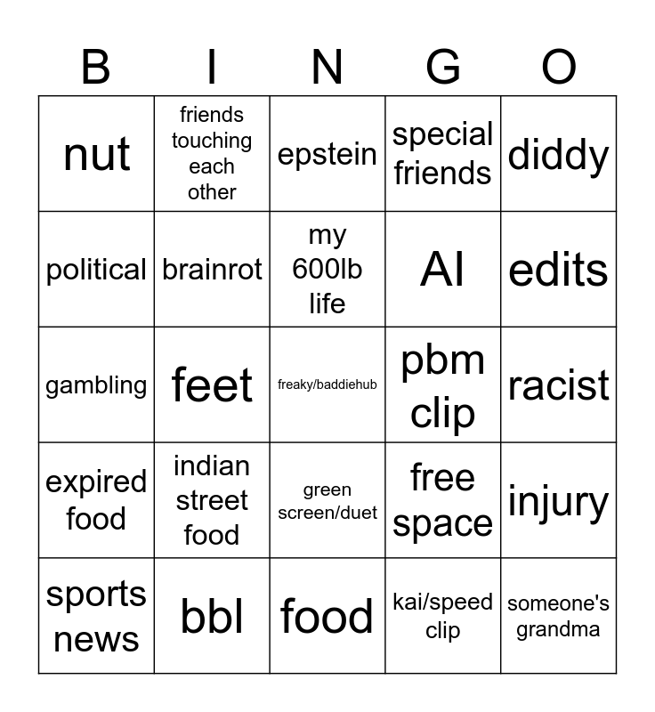This bingo card has 25 words: indian street food, food, my 600lb life, sports news, diddy, nut, political, friends touching each other, pbm clip, green screen/duet, AI, gambling, free space, injury, brainrot, someone's grandma, racist, epstein, edits, feet, freaky/baddiehub, bbl, expired food, special friends and kai/speed clip.