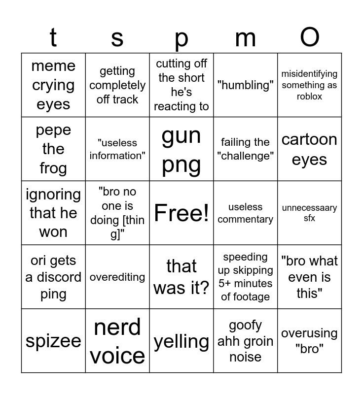 This bingo card has a free space and 24 words: overediting, nerd voice, gun png, spizee, misidentifying something as roblox, meme crying eyes, pepe the frog, getting completely off track, useless commentary, that was it?, failing the "challenge", ignoring that he won, speeding up skipping 5+ minutes of footage, "bro what even is this", "useless information", goofy ahh groin noise, unnecessaary sfx, cutting off the short he's reacting to, cartoon eyes, "bro no one is doing [thin g]", overusing "bro", ori gets a discord ping, "humbling" and yelling.