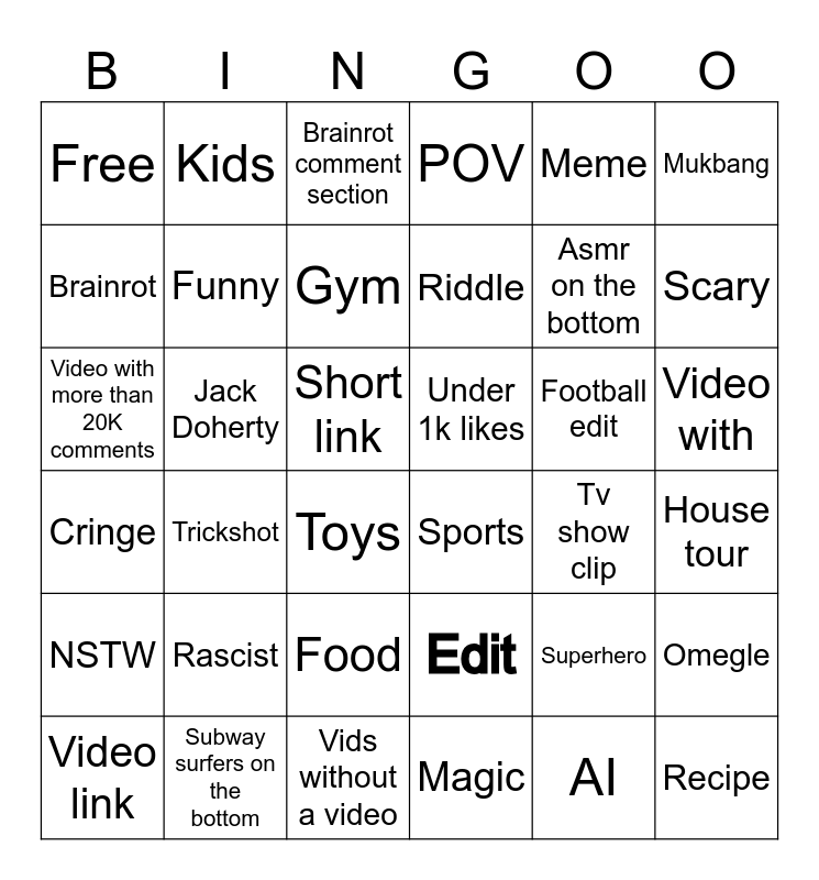 This bingo card has 36 words: Edit, Food, Magic, Brainrot, Cringe, Under 1k likes, Funny, Vids without a video, Meme, Superhero, Scary, POV, Omegle, Jack Doherty, Riddle, Free, NSTW, Football edit, Video with more than 20K comments, Brainrot comment section, Short link, Trickshot, Sports, Toys, Tv show clip, Kids, Asmr on the bottom, Subway surfers on the bottom, Gym, Mukbang, Recipe, Video link, House tour, Video with, Rascist and AI.